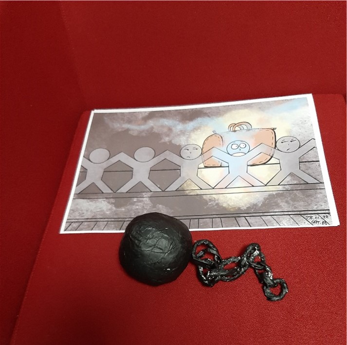Catherine, elle, connaît ce sentiment. Elle l’a vécu, elle était au Bataclan le soir du 13 novembre 2015. Profondément choquée par ce qu’elle a traversé, elle se met à dessiner. Un boulet déboule sur le papier et roule comme roulent son stress post-traumatique, ses cauchemars, ses angoisses, ses crises, … Elle le traîne avec elle puis elle lui donne vie, tout d’abord en publiant Chroniques d’une survivante, puis spécifiquement pour Margaux en créant un objet-boulet avec du papier mâché et de la peinture. Il « matérialise [s]es souffrances qui sont, par définition, invisibles. Cela les rend visibles ». Pour elle, ce boulet fabriqué de papier journal et de colle a une visée thérapeutique et est hautement symbolique. Elle a écrit entre les différentes couches de papier les états par lesquels elle est passée, elle les a ensuite « recouverts » par plus de peinture et de colle. Ce sentiment enfoui, elle le voit comme « quelque chose qui a besoin d’être extrait de [son] cerveau » et évoque sa jubilation à avoir fabriqué ce boulet qui n’était jusque-là qu’en deux dimensions, sa satisfaction à se trouver dans une « phase d’action ».