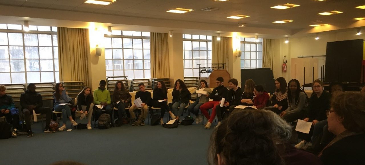 Et puis, ce fut le moment de la rencontre avec Danièle et Michel. Les élèves avaient participé à une petite vidéo pour accueillir nos témoins où ils prononçaient à leur intention un simple mot et où ils évoquaient leur souvenir d’un attentat. Danièle et Michel prirent chacun leur tour la parole, témoignèrent et échangèrent avec eux. Combien aussi ai-je aimé voir quelques-uns d’entre eux retourner voir les deux témoins et leur parler, leur poser des questions, prolonger l’échange encore. Ce fut un moment assez extraordinaire, au sens propre du terme, un moment qui nous a tous sorti de l’ordinaire, tant parce qu’il évoquait des évènements que nous aimerions tellement ne jamais revoir, tant par l’intensité de ce qui se racontait, se pensait et j’espère se transmettait. Ce fut un moment rare. Rare par son intensité, rare parce que nous avons rencontré des personnes extraordinaires d’humanité et d’humanisme qui sont venues nous parler d’elles telles qu’elles étaient, qui se sont découvertes et ouvertes à nous, pourtant tous des inconnus. Elles ont partagé avec nous sans retenue ce qu’elles ressentaient, et écouté, répondu à chacun. J’ai compris après, combien ce qui m’avait émue et bouleversée était bien sûr ces morceaux de vie, l’émotion brute qui en émanait, mais surtout leur immense générosité à tous les deux. C’est de cela que j’aimerais tellement les remercier. »
