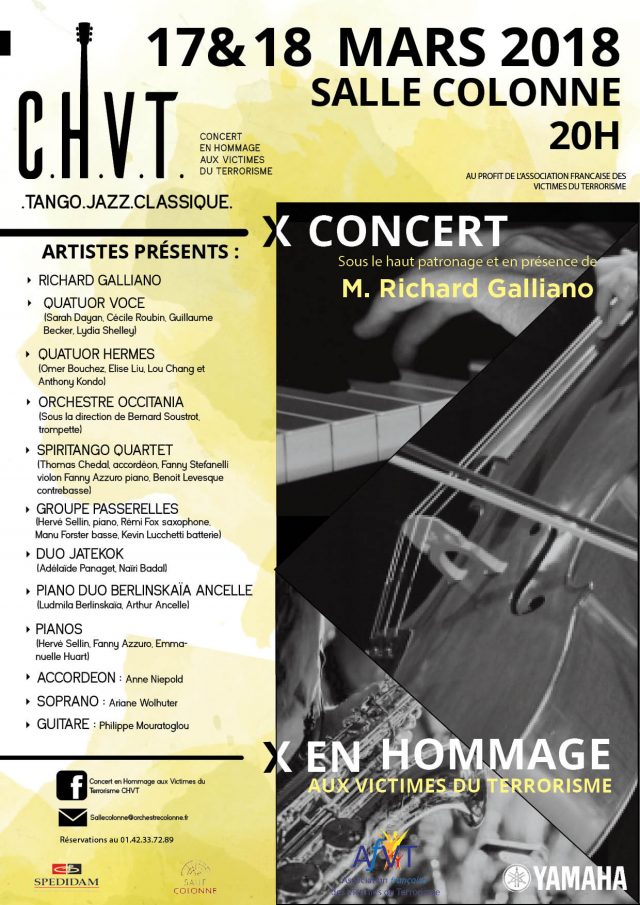 À l’initiative de la pianiste Fanny Azzuro, deux concerts sont organisés Salle Colonne à Paris, en solidarité avec les victimes de terrorisme, tous les bénéfices iront à l’Association Française des Victimes de Terrorisme.