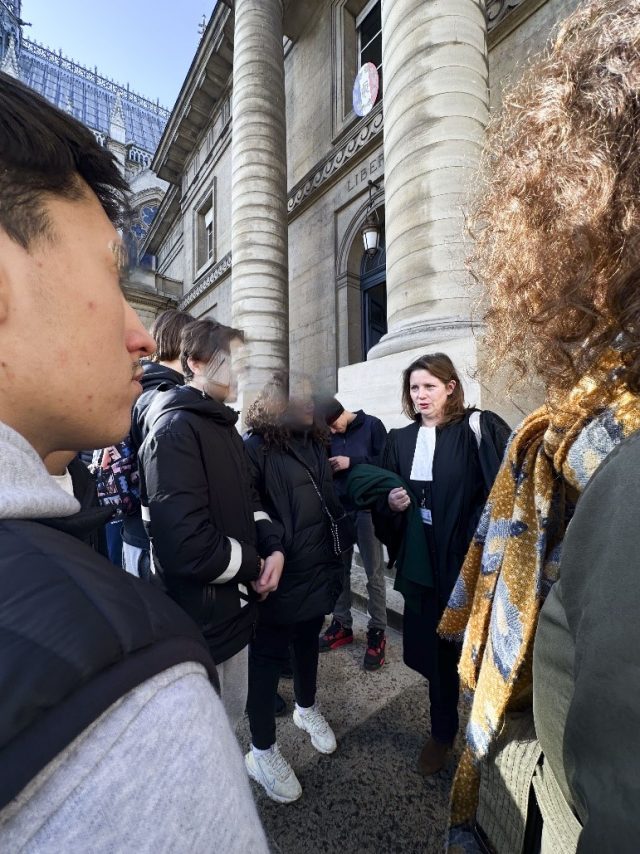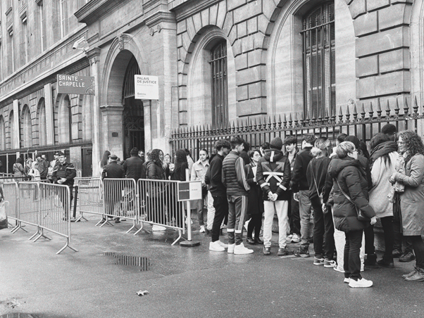 Un expresso fumant trône devant moi sur le comptoir de la mythique brasserie les Deux Palais, située face aux grandes grilles dorées du Palais de Justice sur l’Île de la Cité. Ce n’est pas la première fois que je reviens au Palais mais la sensation de revenir assister à V13 est tenace. L’objectif est tout autre aujourd’hui. Je sors de ma rêverie lorsque Blanche, Virginie et Céline Pichot (documentaliste du Lycée), ainsi que Chantal Anglade, me rejoignent pour démarrer cette demi-journée de sortie -pour reprendre le jargon professoral- au Palais. Le procès de Nice a bien avancé, c’est aujourd’hui que Frédérique Giffard reprend place face à la Cour. Pour des raisons liées à la sécurité nous assisterons à la plaidoirie depuis une salle de retransmission située sur le « plateau correctionnel ». Après un deuxième café, nous filons retrouver le groupe de jeunes devant les portes historiques du Palais. Je surveille de loin et en profite pour prendre une photo des élèves qui font la queue entre les barrières Vauban censées sécuriser les lieux. Les élèves bavardent entre eux alors que les gendarmes (prévenus en amont) leur font passer les portiques de sécurité. Tout ce petit monde se réunit dans la cour de la Sainte Chapelle et les bavardages reprennent. Avant que les élèves n’entrent dans la salle de retransmission, nous leur faisons un dernier briefing : « Bien que vous alliez entrer dans une salle de retransmission, ce sont les mêmes règles que dans la salle principale. Pas de téléphone portable et on parle à voix basse. » Les instructions passées, j’observe la masse d’élèves pousser les lourdes portes en bois de la salle d’audience réquisitionnée. Pour assister au procès, je décide de faire le tour et d’écouter Maître Giffard depuis les bancs de la « Grande Salle » alors que Chantal, Blanche, Virginie et Céline restent avec les élèves. Comme à chaque fois que je reviens entre les grands murs en bois de la salle Grands Procès, je suis saisi par la solennité qu’impose le lieu, le gigantisme toujours, étouffant. L’odeur de la moquette me rappelle de vieux souvenirs. Je m’installe là où je le faisais l’année d’avant et observe Frédérique Giffard s’avancer à la barre. Comme à V13, la multiplicité de victimes a forcé les avocats à thématiser leurs plaidoiries. Frédérique plaide sur la solitude. Sur les écrans de retransmission, je l’observe s’avancer d’un pas décidé vers le petit pupitre sous le regard de toutes les parties et installer sa tablette. Comme à V13, un grand silence règne dans l’immense salle construite exclusivement pour ces grands procès. La voix de Frédérique résonne :
