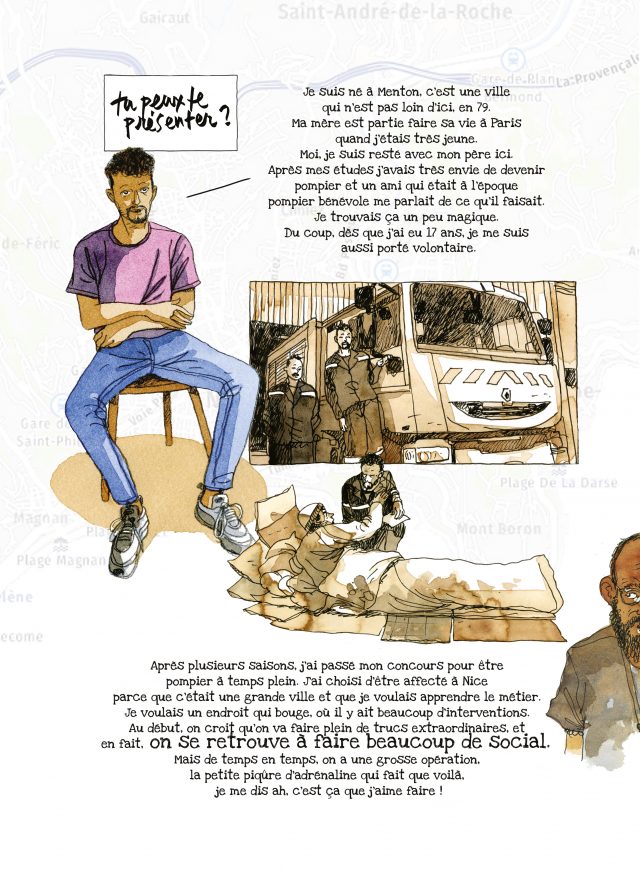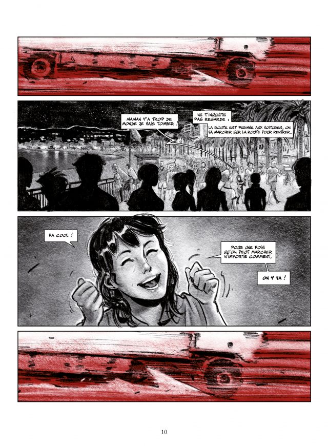 J’étais en contact avec Séraphin Alava, président de l’Association Les Militants des Savoirs à Toulouse à l’origine du projet. Séraphin travaille sur la radicalisation et plus précisément sur la prévention, c’est un expert. Nous avions envisagé un projet avec une autrice, projet avorté qui finalement ne verra pas le jour. Alors comme l’envie de travailler ensemble nous était restée et que Séraphin avait l’idée de travailler sur les témoignages des victimes de l’attentat du 14 juillet à Nice pour leur rendre hommage, il m’a envoyé un gros dossier et m’a dit qu’il voulait faire un livre un peu comme un carnet de voyage avec des interprétations artistiques des récits incluant des graffeurs, des photographes, des sculpteurs ou encore des peintres. Comme vous pouvez le voir, l’album n’a rien à voir avec un carnet de voyage. J’ai pris ce gros dossier, je l’ai lu et j’ai laissé mûrir un peu. J’ai pensé à un collectif de récits courts par des auteurs de BD que je connais et qui me semblaient pouvoir entrer dans ce rôle, principalement parce que j’ai déjà une expérience réussie en matière de collectif et ça m’a tout de suite semblé le support le plus intéressant pour allier le talent, l’esthétique et l’authenticité pour ne pas dire la violence des histoires tout en étant capable de transmettre sans injonction ni culpabilité. Trouver des auteurs a été assez rapide car les auteurs, même avec quelques hésitations, ont été intéressés par le projet. Le plus difficile a été de trouver une couverture. Joël Alessandra a dessiné une atmosphère joyeuse et de fête, ce qui aurait dû être. Le message se trouve déjà dans la couverture : ça aurait dû, ça n’a pas été, pourquoi ? Au lecteur de tenter d’y apporter une réponse