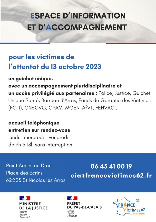 Vous êtes victime de l’attentat du 13 octobre 2023 à ARRAS, vous avez des questions, vous avez besoin d’aide, l’EIA est là pour vous aider et vous accompagner. Toutes les informations ici 👇