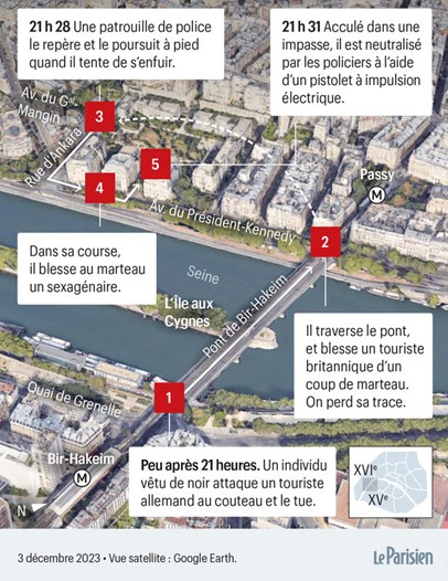 Le samedi 2 décembre 2023, Armand RAJBPOUR-MIYANDOAD, a agressé plusieurs personnes le sur et à proximité du pont de Bir-Hakeim dans le 15e arrondissement de Paris, près de la Tour Eiffel.