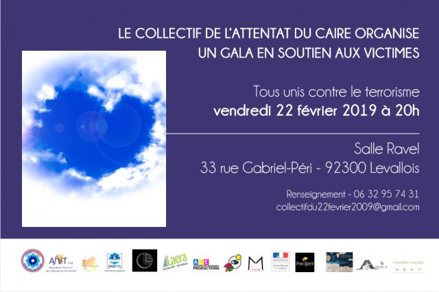 Le 22 février 2019 marquera 10 ans d’un chemin de résilience post attentat du Caire, dans lesquels les jeunes, les animateurs et leurs parents ont continué à vivre sans avoir oublié. Face à la réalité des conséquences du terrorisme sur l’humanité, le collectif de l’attentat du 22 février 2009 a souhaité organiser, dans le cadre de la commémoration des 10 ans de l’attentat du Caire, Un Gala Solidaire. Celui-ci aura lieu à Levallois le 22 février 2019, dès 20h.