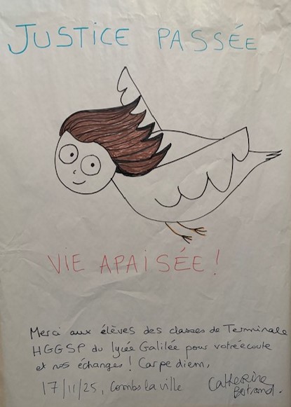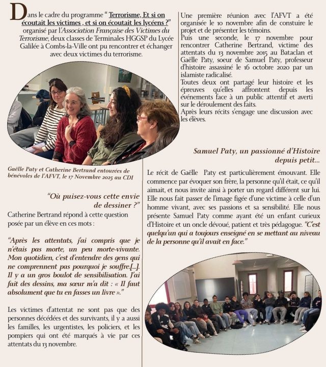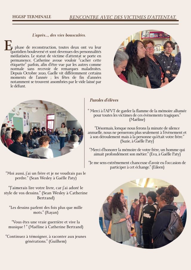 Coralie et Cyril, les deux professeurs de Terminale HGGSP du lycée Galilée de Combs-la-Ville se demandaient : Quelle mémoire garde-t-on ? Comment peut-on réparer ? La justice, est-ce que cela suffit pour répondre au terrorisme ?
