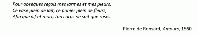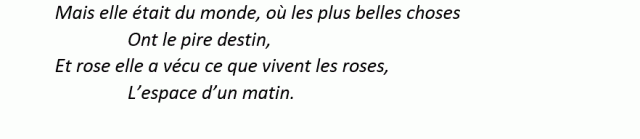 Novembre 2015 : Ainsi en ta première et jeune nouveauté, / Quand la terre et le ciel honoraient ta beauté, / La Parque t’a tuée, et cendres tu reposes.