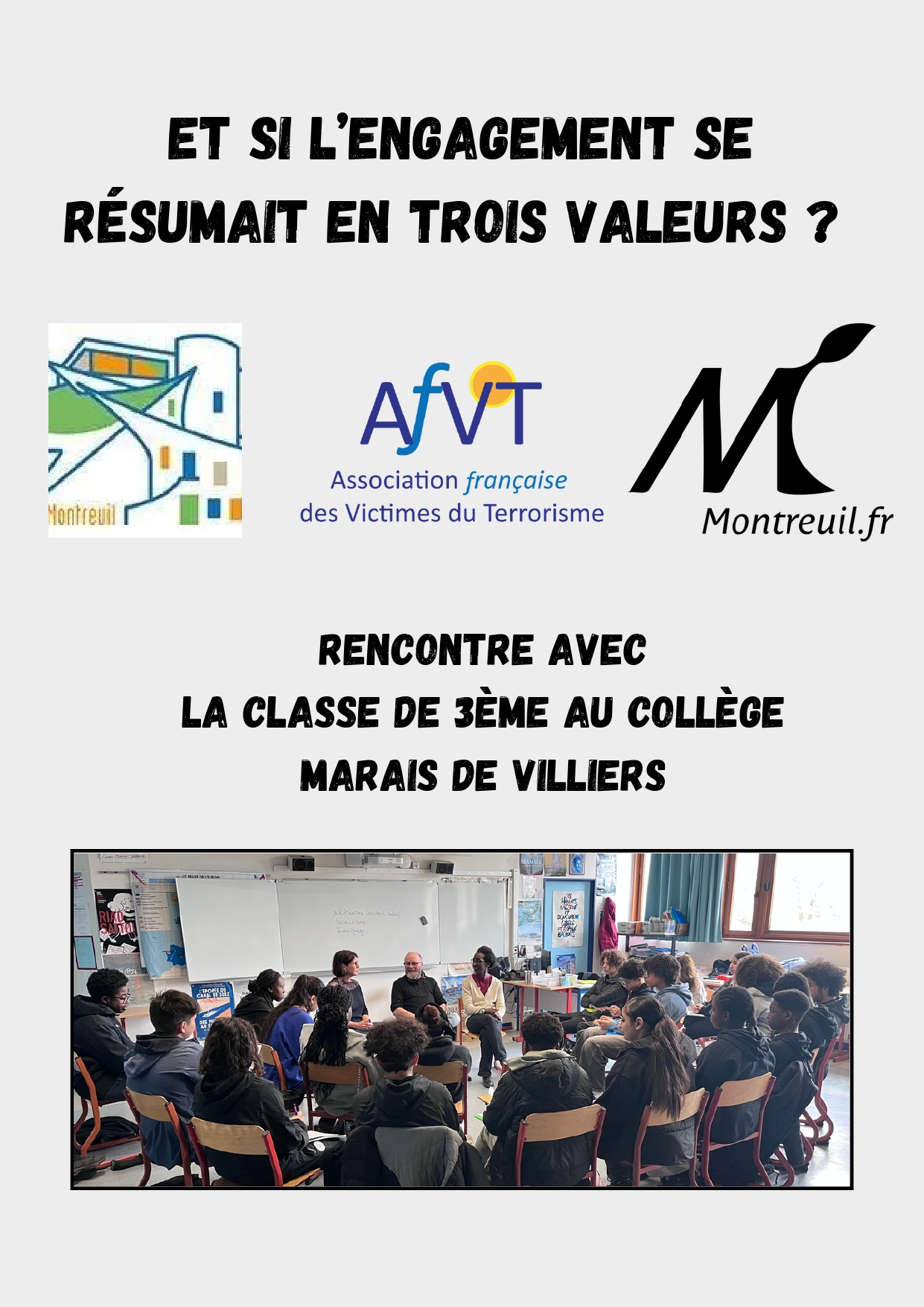 Les raisons de l’engagement reposent souvent sur des valeurs comme le respect, la solidarité et la justice. Certaines personnes s’engagent pour aider les autres, protéger des victimes ou défendre des droits. L’engagement peut aussi naître d’une expérience personnelle marquante qui donne envie d’agir et de transmettre un message. C’est le sens de la rencontre qui a eu lieu le vendredi 3 avril 2026 au collège Marais de Villiers entre une vingtaine de collégiens de 3ème et deux victimes d’attentat terroriste.  Car s’engager c’est aussi contribuer à une société plus juste, soutenir ceux qui en ont besoin et encourager les autres à agir à leur tour.