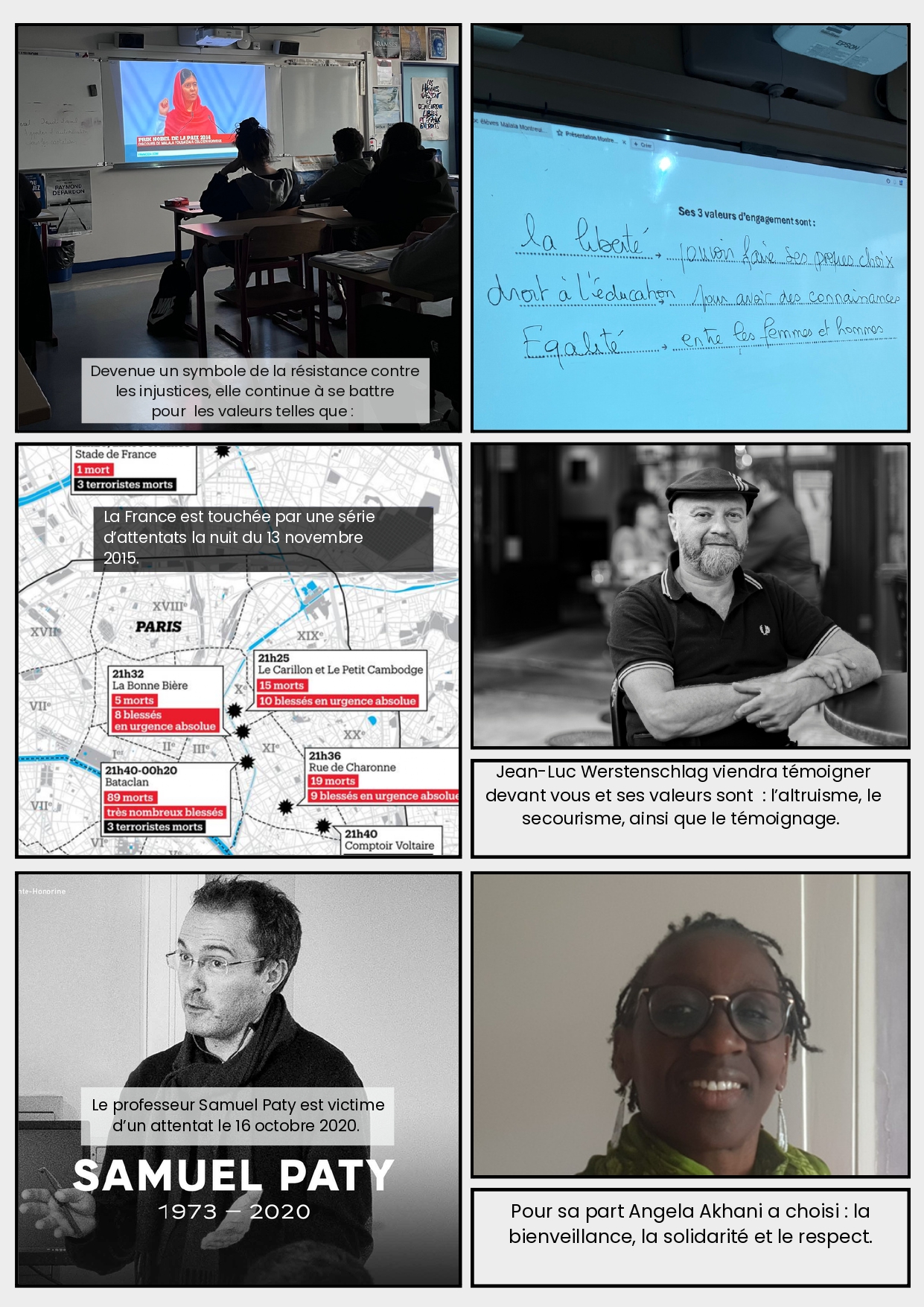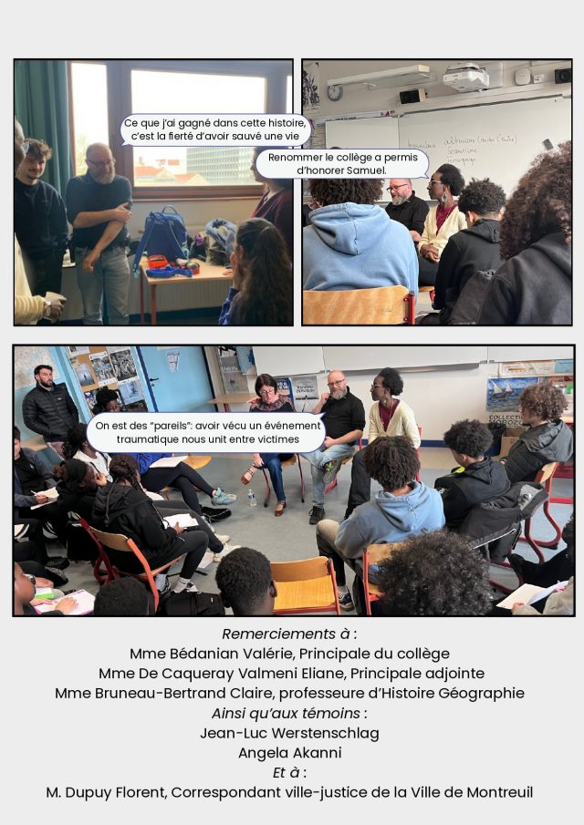 Fatma lui demande si elle considère cet évènement comme un traumatisme, ce à quoi Angela répond: « C’est quelque chose qui a marqué toute ma vie. Pendant longtemps je ne pouvais pas sortir par la droite du collège, parce que c’est là que ça s’est passé. Lorsque l’on a évoqué le changement de nom du collège,  je n’étais pas certaine d’être d’accord, et de vouloir entendre le nom de Samuel Paty au quotidien. Ensuite, j’ai réalisé que renommer le collège au nom de Samuel Paty était une victoire et un honneur, face à la tentative de l’effacer. »