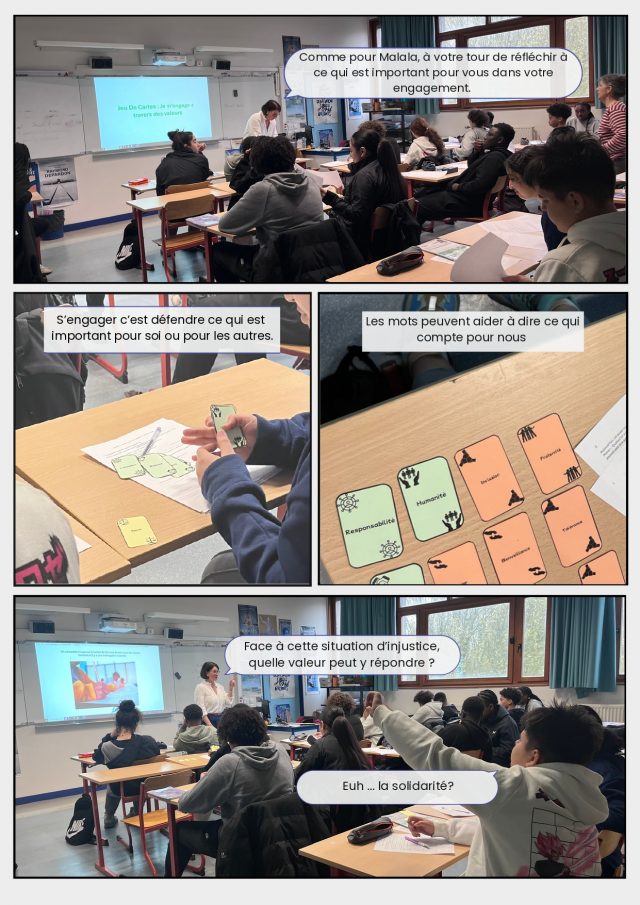 Résumé : L’article raconte une rencontre entre des élèves et deux témoins, Jean-Luc et Angela, autour des valeurs de l’engagement. Deux élèves, présentent d’abord leurs valeurs principales : l’égalité, le respect, la bienveillance, la justice et les droits. Ces valeurs font écho à celles des témoins.