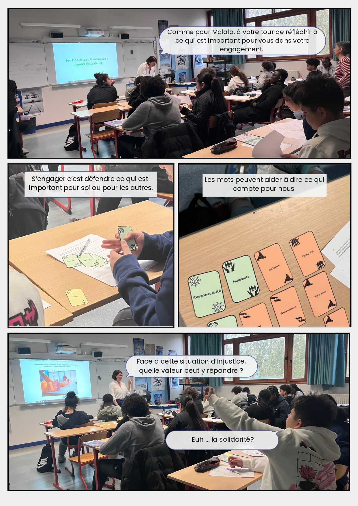 Pour Aminata, les trois valeurs retenues sont le respect nécessaire au fonctionnement d’une société, la justice qui permet à tous d’être égaux, et les droits : « Chacun et chacune a ses droits et peut les appliquer ».