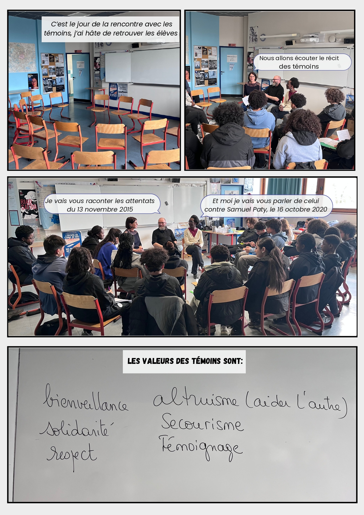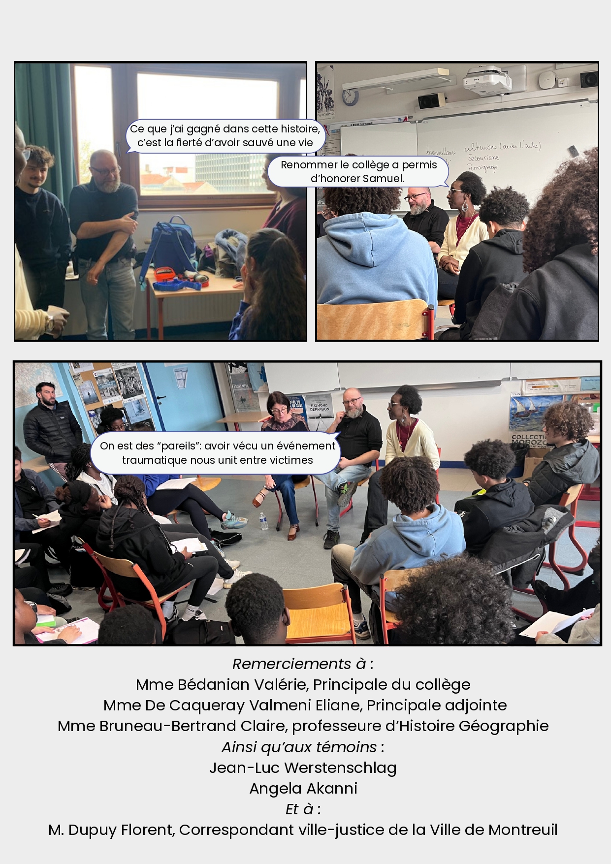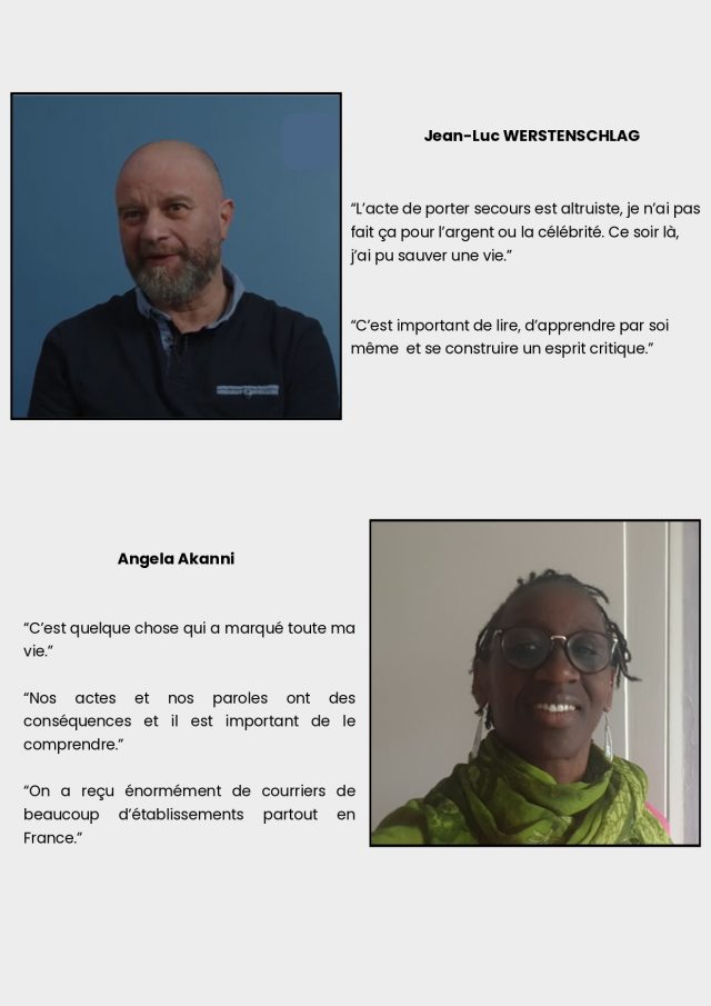 « Cela permet de prendre conscience qu’un mensonge, que les paroles et les actes ont un impact : on ne peut pas dire n’importe quoi, car cela peut entraîner des conséquences graves. » Jean Luc renchérit en expliquant : « il est important de se construire soit même, il souligne l’importance de lire les livres, de se renseigner, d’apprendre par soi-même, de se construire un esprit critique ». Pour eux, c’est le rôle du témoignage.