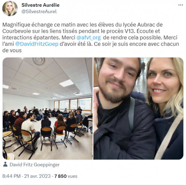 « Cette année m’a bousculée, poussée dans mes retranchements, parfois galvanisée. J’ai eu l’impression de beaucoup avancer. Pendant six ans de faire avec ma peine puis de ranger les choses dans les bons tiroirs. Pour moi, la grande découverte du procès, c’est la fin de la solitude. Il n’y a pas d’âge pour se faire des amis d’enfance, rencontrer des copains de tranchées » disait Aurélie au micro de radio france au sujet de V13.
