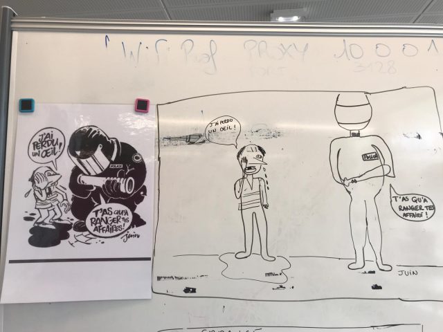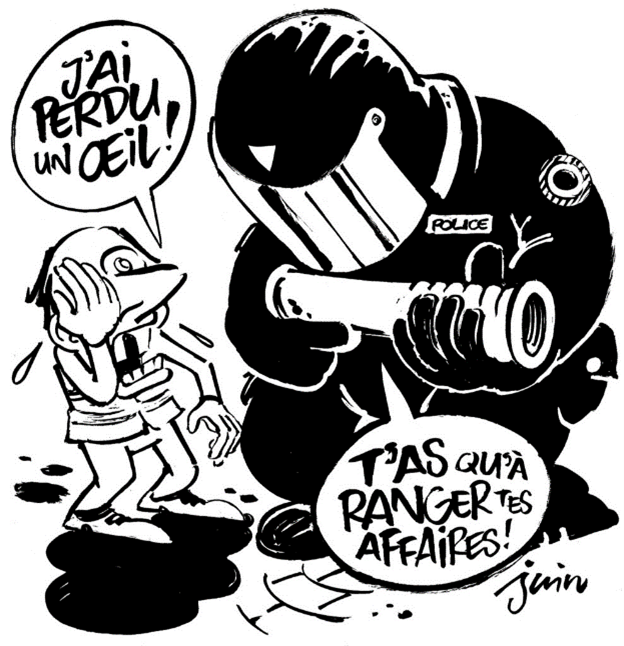 Troisième groupe : les violences policières, dessin de Juin, Charlie Hebdo, numéro 1384 du 30 janvier 2019, en dernière page « découvrez gratuitement la Une et les couvertures auxquelles vous avez échappé pour cette édition de votre journal préféré ».
