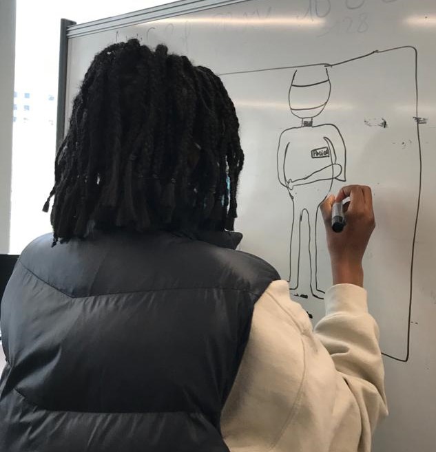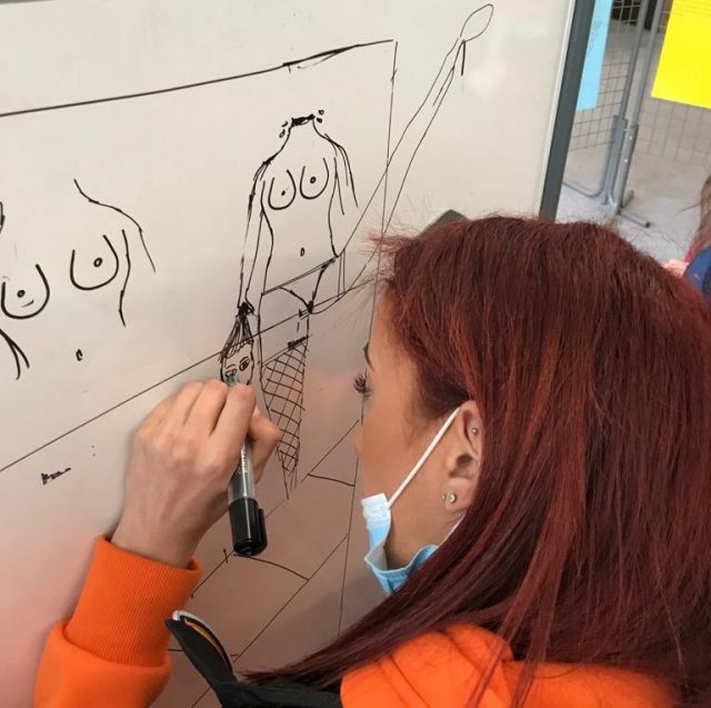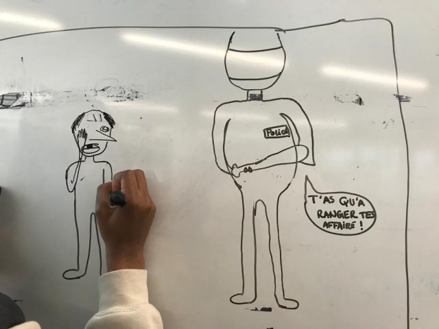 C’était l’objet de cet atelier-rencontre, mené sur plusieurs heures avec une classe de Terminale Gestion Finance, Simon Fieschi, l’Afvt et les enseignantes. Rétifs pour certains, voire franchement hostiles pour d’autres, les élèves ont finalement accepté de se plier à l’exercice. Ils se sont surpris eux-mêmes de leur intérêt pour cet atelier mené au long court. Car il faut prendre du temps pour relever le défi : prendre le temps de la mise en confiance, prendre le temps de la description, de la restitution puis de l’analyse des caricatures, du temps aussi pour l’échange, le vrai dialogue.
