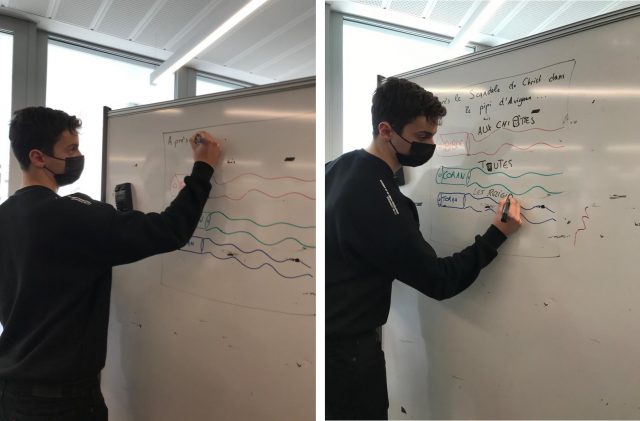 En face du grand tableau blanc, un dessinateur va devoir dessiner ce qu’il n’a pas vu mais que d’autres ont vu et lui transmettent par des mots. On décale entre qui a vu et qui dessine. La main est décorrélée de l’œil et progresse dans le dessin à l’aveugle, sans intention, sur indications. Comme quelqu’un pose quatre assiettes, quatre fourchettes, couteaux et verres, sans penser : je mets la table. Sans la perpétuelle petite avance du sens. L’intention anticipe. L’émotion aussi. Alors, factuellement faire.