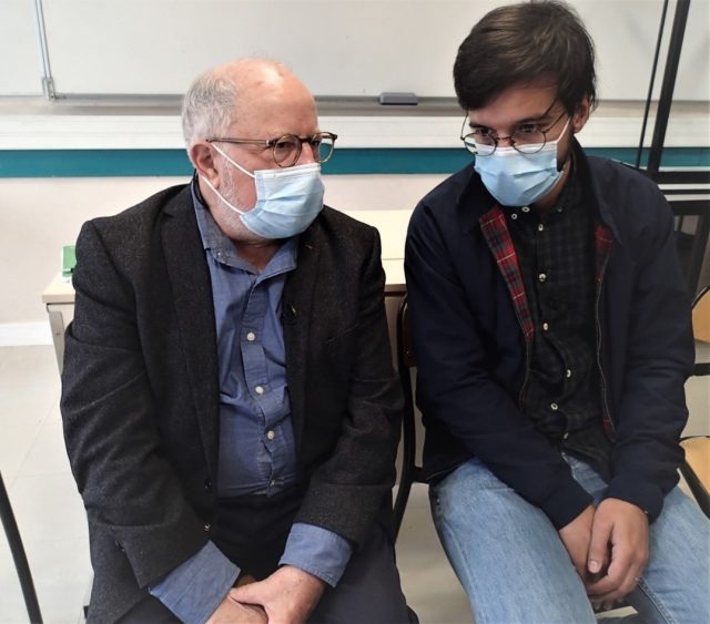 Agathe, lycéenne de terminale, l’a dit dès la fin de la rencontre : je voudrais écrire et faire vivre dans mon texte Jonathan, Arié et Gabriel, et nous l’avons crue. En prévision de la publication de son texte, nous l’avons prise en photo avec Samuel Sandler, et leur avons demandé à tous les deux de bien vouloir enlever leurs masques.