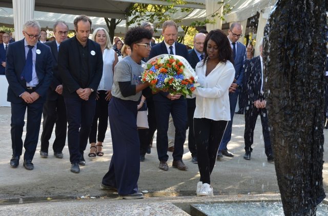 Les élèves ont participé à la cérémonie en distribuant des roses au public, destinées à être déposées au pied de la statue-fontaine « Mémoire Portée ». Au nom de l’AfVT, un lycéen de Seconde du lycée Georges Braque et une étudiante de BTS du lycée Julie-Victoire Daubié ont déposé une gerbe en hommage aux victimes du terrorisme.