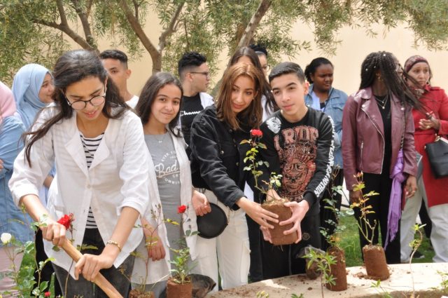 Après les ateliers, un très beau moment symbolique a lieu : nous plantons des rosiers dans la cour du lycée, entre élèves marocains et français, main dans la main.