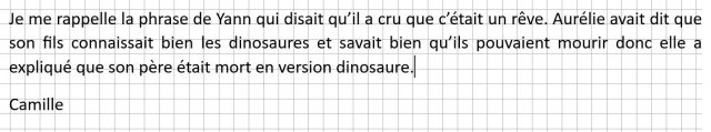 Aurélie : alors, moi, immédiatement après, ça a été difficile parce que j’habitais à côté de la place de la République. Il y avait des tonnes de fleurs. (…) J’étais encore face à la dissociation, c’est un mécanisme de résistance du cerveau qui permet de se mettre à côté de soi, pour pas être trop choqué.