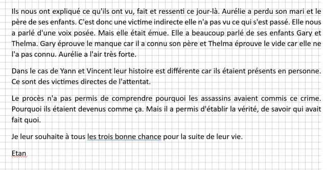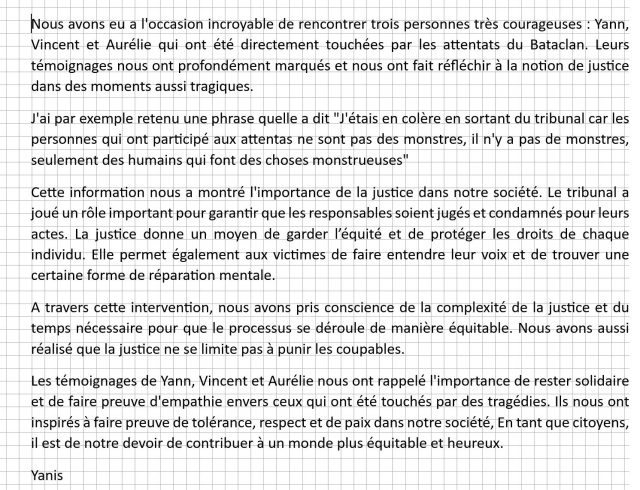 Aurélie et Yann se sont beaucoup rendus au procès V13, ce qui explique leur participation à ce projet « Justice et démocratie ». De plus, Matthieu était très ami avec Antoine Gentil, l’un des professeurs de la classe Starter.