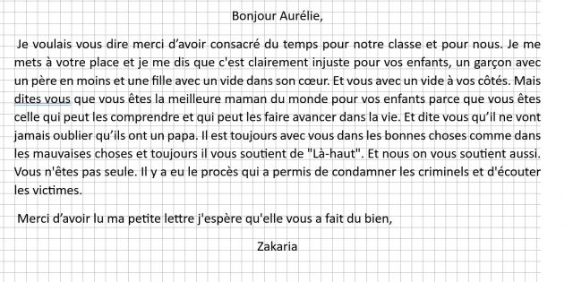 Aurélie : Mon expérience au procès, elle a changé le moment où j’ai entendu le père de l’homme qui a tué Matthieu venir témoigner en fait. Je suis arrivée en retard, je ne savais pas que c’était lui, et donc je m’assoie, je dis à mon voisin « c’est qui lui ? – c’est le père de Samy Amimour – Ah, ok ! »