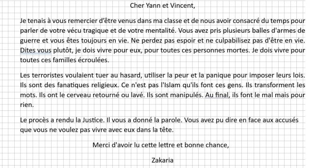 Malheureusement, ils sont moins attentifs à notre retour. Il faut aussi savoir que tout au long de la journée, des élèves entrent dans la classe, et c’est mieux de venir en retard que de ne pas venir du tout, nous comprenons. Ce phénomène continue l’après-midi et un élève fait une entrée assez remarquée, en tout cas de notre point de vue.  Ce dernier arrive juste après la lecture de la déposition d’Aurélie Silvestre au procès des attentats du 13 novembre 2015. Alors que l’on parle de ce qui fait des parties civiles à ce procès des « cibles idéales », Lais arrive en nous demandant de quoi on parle. Quand il entend le mot « terrorisme », il fait tout de suite le rapprochement avec son séjour à Bruxelles : « j’étais à Molenbeek », c’était bien parce que « c’était comme le bled ». Il y a rencontré les voisins de Salah Abdeslam, « ils étaient sympas ». « Mais est-ce que ses voisins sont responsables de ce qu’il a fait ? », lui répondons-nous. Nous concluons ensemble que non.