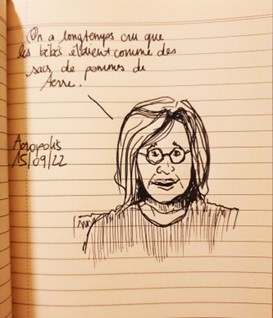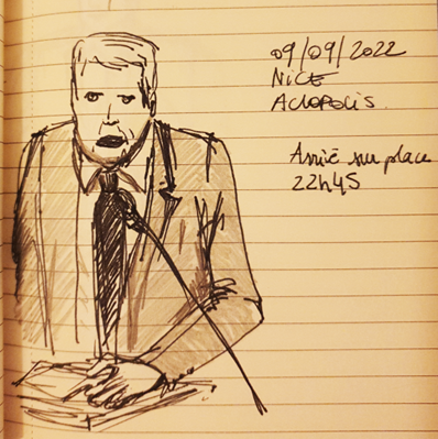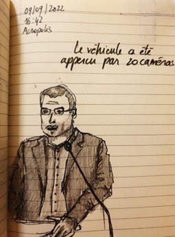 Une phrase que je retiens, c’est un commissaire qui l’a dite le vendredi 9 septembre. Un avocat de la partie civile lui demande si l’attentat aurait pu survenir durant l’euro 2016, étant donné le dispositif sécuritaire renforcé lors de cet événement. Il répond, sans se mouiller, en disant un peu embêté : « Oui, non, enfin, je ne peux pas répondre à cette question, le périmètre était différent, il était clos… ». Je me demande alors : « Hum Hum… N’est-on pas obligé de dire la vérité à la barre ? ».
