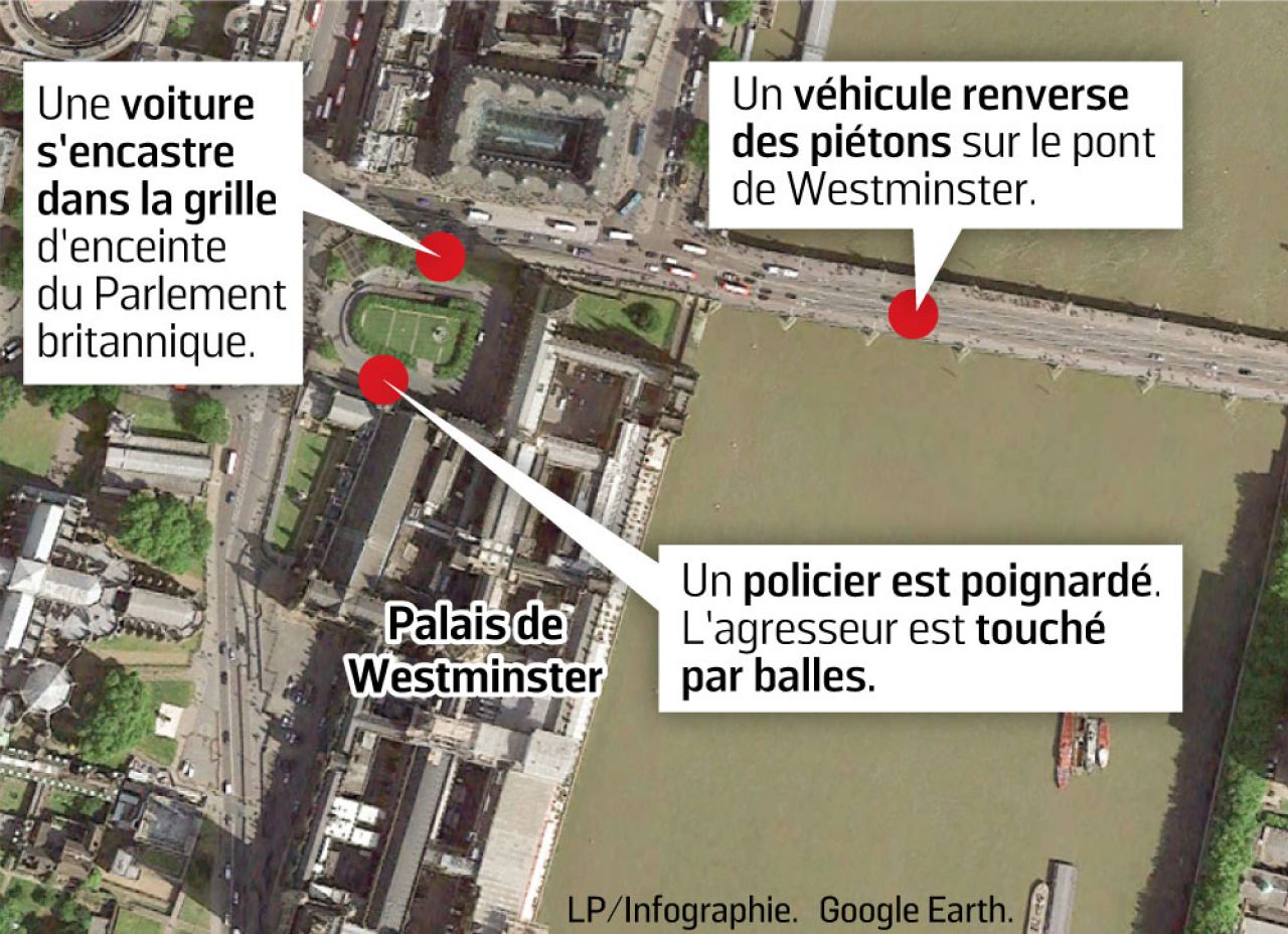 L’individu sort alors subitement de son véhicule. Armé d’un couteau et déterminé, il fonce vers l’entrée principale du parlement où un membre de la garde de Protection Diplomatique et Parlementaire, Keith Palmer, est en faction. Ce dernier sera mortellement poignardé par l’assaillant qui, à son tour, décédera sous le feu de deux autres membres de la garde.